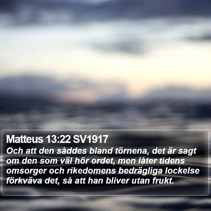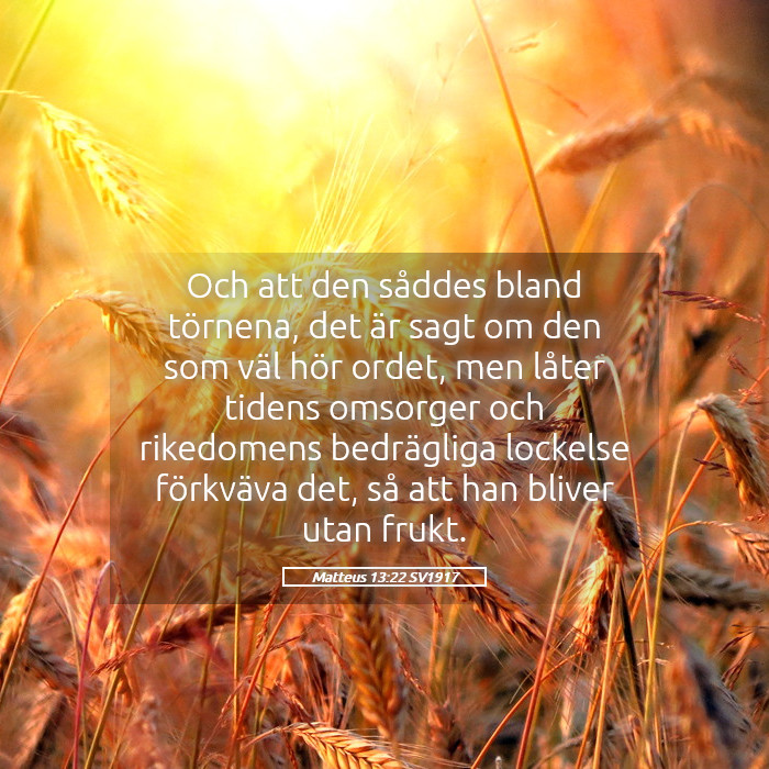”Men vad som blev sått bland törnen, det är den som hör ordet; men världsliga bekymmer och rikedomens bedräglighet förkväva ordet, så att det bliver utan frukt.”