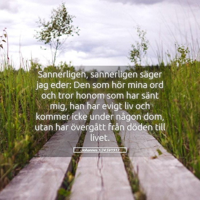 Johannes 5:24 – "Sannerligen, sannerligen säger jag eder: Den som hör mitt ord och tror på honom som har sänt mig, han har evigt liv och kommer icke under domen, utan har övergått från döden till livet."