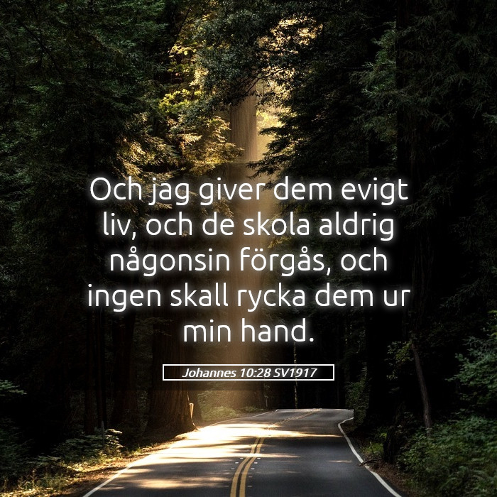 Johannes 10:28 – "Och jag giver dem evigt liv, och de skola aldrig någonsin förgås, och ingen skall rycka dem ur min hand."